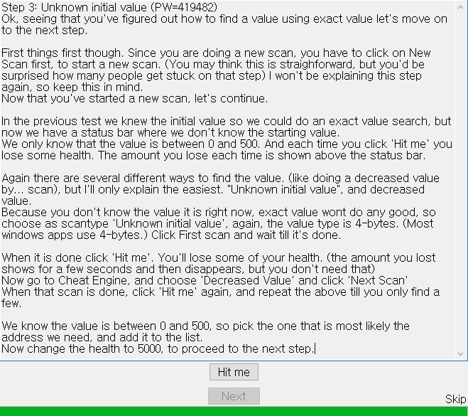 2. 이후 프로그램에서 Hit me 버튼을 눌러 체력을 감소시킨 후(-1) Scan Type을 ‘Decreased value by ...’로 지정하고 Value에는 1을 넣어 Next Scan 버튼을 누른다. address list가 많이 좁혀졌다. 확실한 address를 찾을 때까지 이러한 작업을 반복해준다.