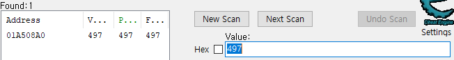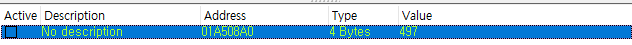 - change value 버튼을 클릭해서 현재 내 값이 497이기 때문에 497을 value로 갖는 address를 스캔함. 더블클릭하여 아래에 있는 주소 리스트에 추가해주었음.