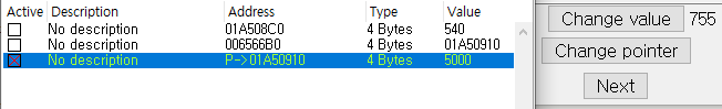- 만들어준 다중 포인터의 value를 5000으로 바꾼 후 Active 체크박스를 눌러 얼리고 프로그램에서 Change pointer를 눌러 바꾸더라도 실제적으로 시작 포인터가 가리키고 있는 값은 5000으로 고정되어 있는 것을 확인해볼 수 있다.