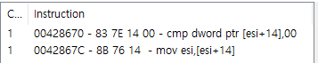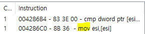 - esi값 01AC8D78을 치트엔진에서 hex를 누르고 First Scan 해주고 나온 address를 주소 리스트에 넣어준다.(여러개 나오면 묶어서 한꺼번에 넣어준다.) 1.의 방식과 마찬가지로 이 주소를 참조하는 다른 포인터를 확인해준다. 실질적으로 mov가 어떠한 값을 넣어주는 명령이므로 이 라인을 보면 된다. esi에 [esi] 주소에 들어있는 값을 넣어주라는 의미이다. 현재 우리 포인터 변수의 주소값(을 어떤 address가 갖고 있는지 다시 New Scan 해서 알아보자.