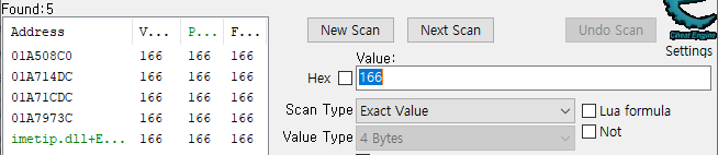 - New Scan 버튼으로 치트엔진을 리셋하고 현재 프로그램에 출력된 값이 166이기에 166을 First scan한다.