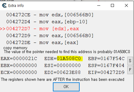- EDX 레지스터의 값이 01A508C0인 것을 알 수 있다. 어떤 포인터 변수가 이 값을 갖고 있겠구나, 어떤 포인터 변수의 값이 이 주소가 되어야지 그 포인터 변수는 여기에 접근해서 어떠한 값(eax)을 넣어줄 수 있겠구나 를 추측할 수 있다.