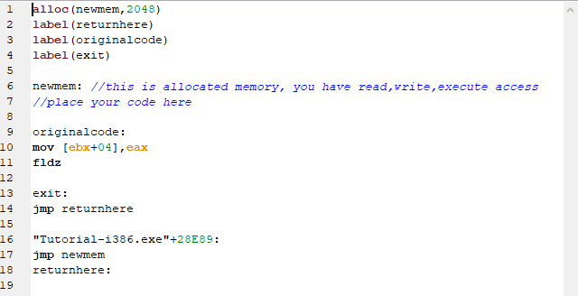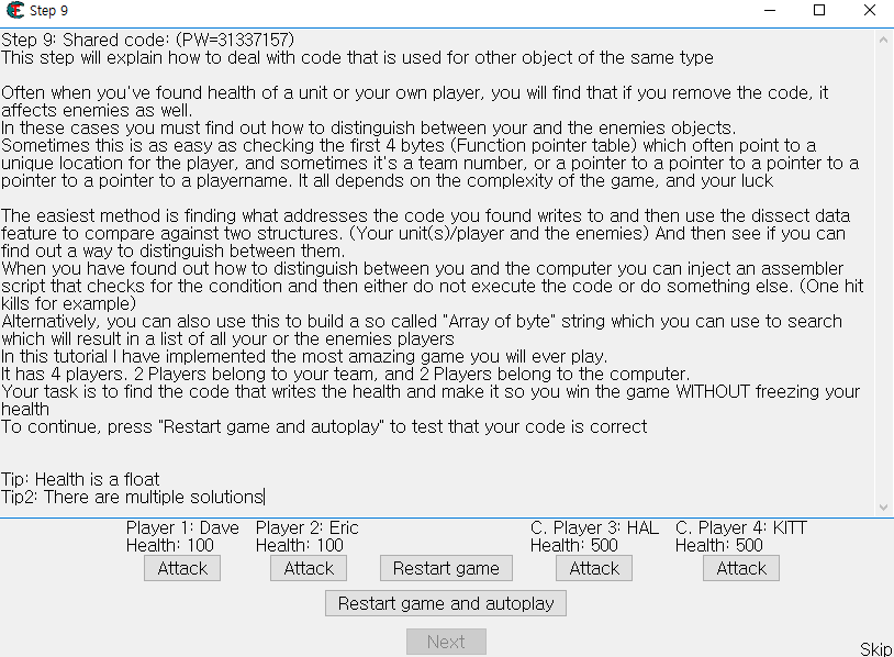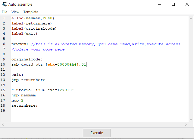 - 다시 1.의 화면으로 돌아와 Show disassembler > Tools > Auto assemble > Template > Code injection을 눌러 코드 템플릿을 생성하고 Dave의 체력값이 깎이지 않게 코드를 수정한다. 원본 코드에서는 체력을 깎는 명령을 수행한 후 exit하는데 우리는 Player의 이름이 Dave일 경우 체력을 감소시키지 않겠다는 명령을 작성할 것이다.