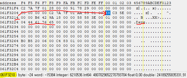 - Dave의 구조체 형태의 변수를 확인하기 위해 주소리스트의 값을 우클릭 > Browse this memory region을 눌러 실질적으로 메모리 영역상에서 061F3210가 어디에 있는지 확인한다. 마지막이 10으로 끝나는 위치(파란블록)를 찾아 왼쪽 아래를 확인하면 잘 찾았다는 것을 의미한다. 파란 블록부터 구조체가 시작하는 부분이라고 추측할 수 있다. 또 아래에는 Player의 이름 정보가 있는데 여기에서(061F3225) 시작주소를 빼면 15h가 나오고 15h가 오프셋이라는 것을 알 수 있다.