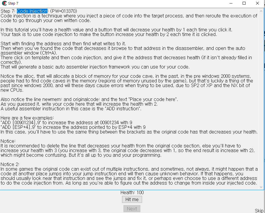 문제: 프로그램 실행 중간에 껴서 우리가 원하는 코드를 삽입하라. (Hit me 버튼을 누를 때 마다 값이 1씩 감소하는 프로그램이 있는데 버튼을 누를 때마다 값이 2씩 증가하도록 Code Injection 수행하기.)