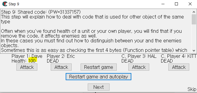 - execute를 하고 프로그램에서 Restart game and autoplay를 눌러주면 Dave를 제외한 플레이어가 체력이 깎여 죽어있다는 것을 볼 수 있다.