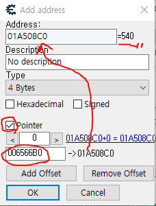 - Add Address Manually 버튼을 눌러 수동으로 포인터 변수를 등록할 수 있다. 우리가 등록할 값이 포인터임을 알리기 위해 Pointer에 체크를 하고 새로 뜨는 아래 화면 입력란에 포인터변수의 주소값인 006566B0을 입력한다. 그럼 → 뒤의 주소(변수)에서 그 변수가 갖고 있는 값이 540이라는 것을 확인할 수 있다.(실제로 프로그램상에서도 540이 출력되어 있음)