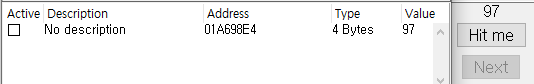 - 맨 처음 디폴트 값이 100이니까 100으로 First Scan을 수행하고 Hit me 버튼을 눌러 값을 계속 감소시키면서 따라 감소하는 address를 찾아 주소 리스트에 등록한다.