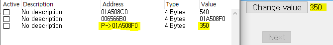 - 프로그램에서 Change value 버튼을 누르고 치트엔진의 address에서 바뀐 값을 체크하고 주소 리스트에 넣어준다.(나의 경우 166→422로 바뀌었음)