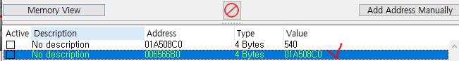 - New Scan을 누른 후 Value의 hex에 체크한 후 01A508C0를 스캔하고 나온 주소를 주소 리스트에 등록한다.