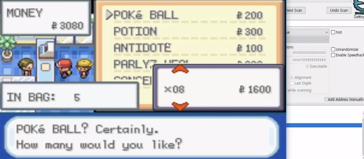 상점에서 팔고 있는 아이템의 가격을 치트엔진에 입력한 뒤 구매 개수를 늘려 해당 아이템의 변화되는 총 가격을 보여주는 변수를 찾아 주소 리스트에 등록하여 value를 0으로 바꾼 뒤 active 시키면 구매를 항상 0원에 할 수 있게 조작한다.