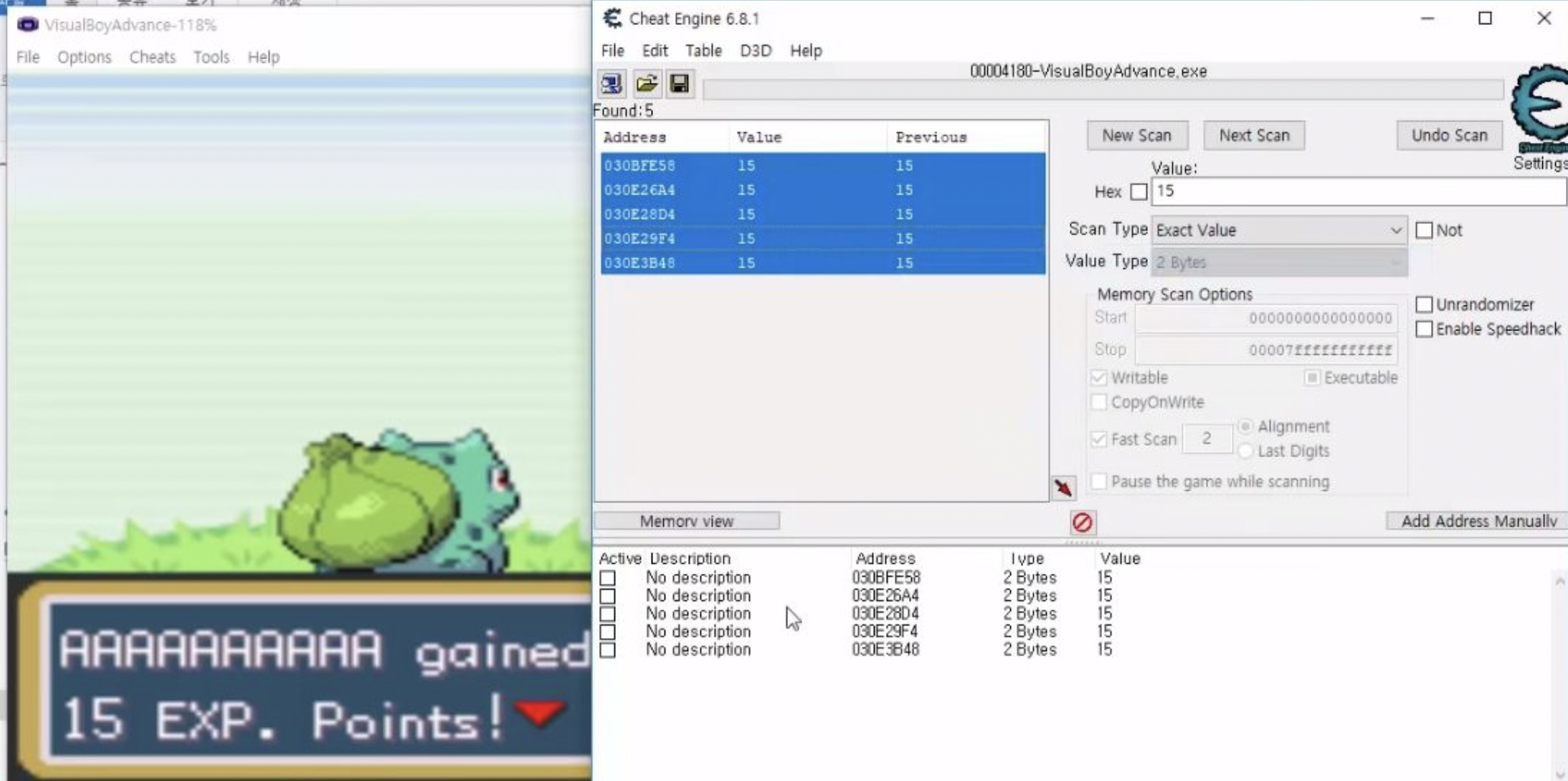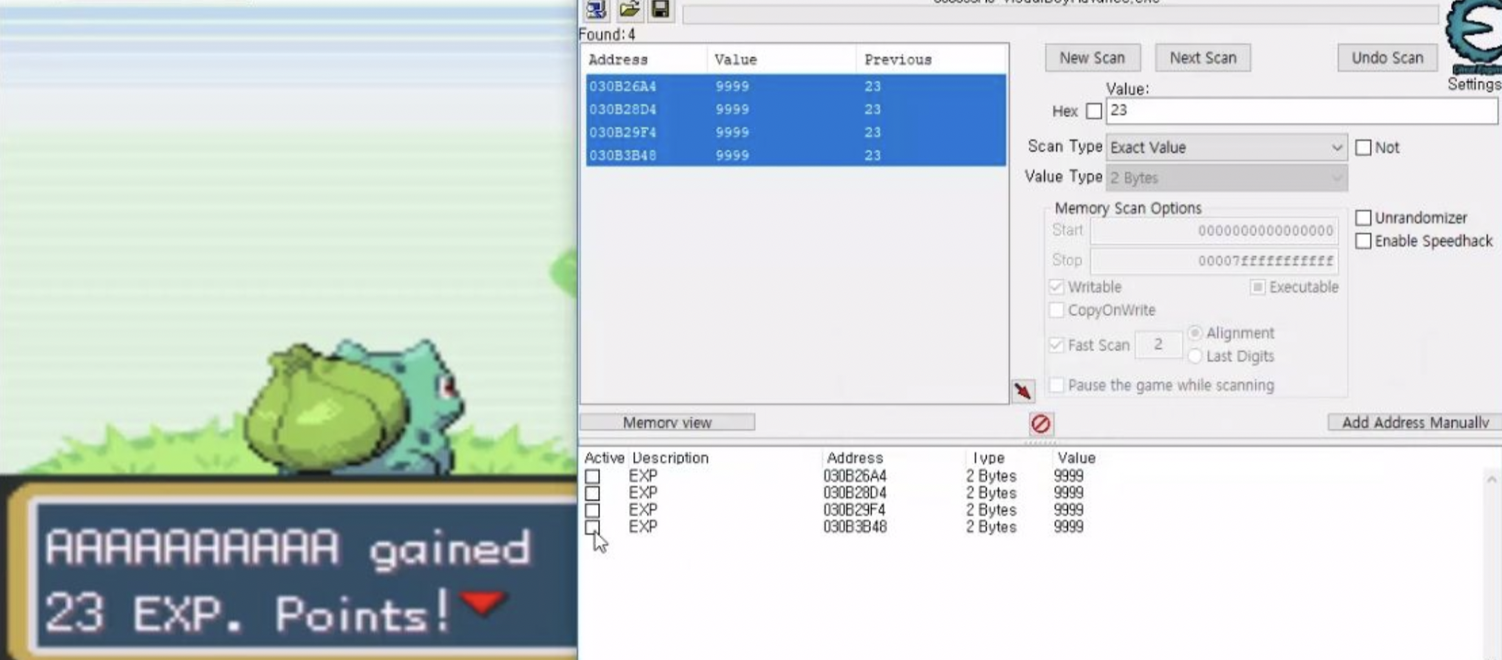 1. 전투에서 얻은 경험치 값을 치트 엔진에 입력하여 해당하는 변수를 찾는다 ( ② 처럼 )