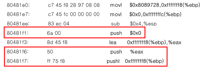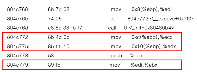 먼저 '/bin/sh'가 들어있는 곳의 주소(0x8089728)을 ebp-8 지점(0xfffffff8)에 넣고 ebp-4 지점(0xfffffffc)에는 0을 넣는다. 이 과정은 sh.c 코드의 shell[0] = "bin/sh";, shell[1] = NULL;과 같다. 이제 이 값들을 PUSH한다. NULL을 push하고, ebp+8의 주소를 eax 레지스터에 넣은 뒤에 eax 레지스터를 PUSH하고, ebp+8 값을 PUSH하면 세 개의 인자를 모두 전달할 수 있다. 인자를 모두 전달하면 call 804c75c<__execve)로 execve()를 호출한다.