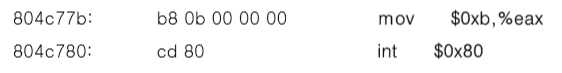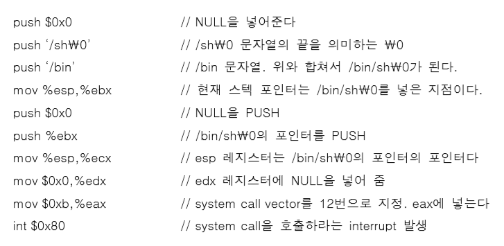 int $0x80은 인터럽트 영역으로 시스템 콜을 하라는 뜻인데, 호출 이전에 eax 레지스터에 시스템 콜 벡터를 지정해주어야 한다. execve()함수에 해당하는 값은 11이므로 eax 레지스터에 11(0xb)를 넣는다.