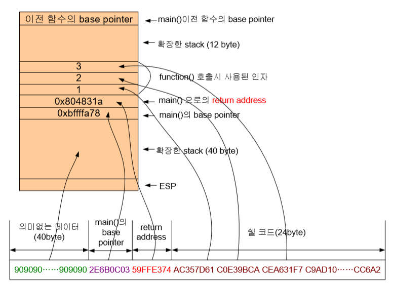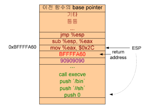 아래 그림은 임의의 공격 코드가 스택 상의 어디에 위치하게 되는지 보여준다.