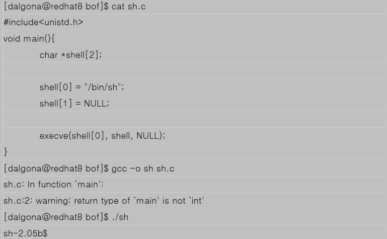 쉘 코드를 만들기 위해 먼저 쉘을 실행시키는 프로그램을 작성하여 어셈블리 코드를 얻어내 일부 수정을 거쳐 바이너리 형태의 데이터를 만들어내야 한다. 쉘을 실행시키려면 '/bin/sh' 명령을 내리면 된다.