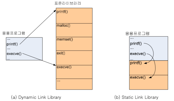 리눅스는 libc라는 라이브러리에 .so 또는 .a라는 확장자 형태로 존재하며 윈도우에서는 DLL 파일로 존재한다. 정적 링크 라이브러리는 운영체제의 영향을 받지 않으며, 실행파일만 가지고 있는 경우가 많다. 하지만 본인이 기계어 코드를 가지고 있는 만큼 실행파일의 크기가 동적 링크 라이브러리 파일에 비해 커질 수 밖에 없다.