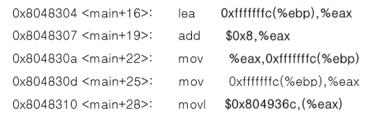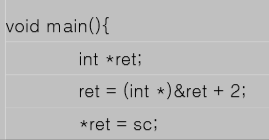 먼저 ebp-4 지점의 address를 eax 레지스터에 넣고, eax 레지스터에 8을 저한다. 이 과정은 main()의 ret = (int *)&ret +2; 과정에 해당한다. ret의 포인터 변수의 주소에 8바이트를 더해서 8바이트 상위의 주소로 만든다. 이때, int *형에 1을 더하면 실제로는 4가 더해지는것과 같으므로 2를 더하면 실제로 8을 더하는 것과 같아진다.