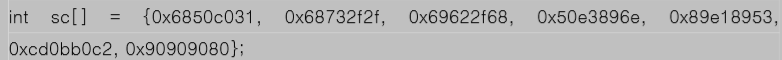 이제 위 sh02.c 코드를 문자열화 해야한다. char형 배열에 16진수 형태의 바이너리 데이터를 전달하기 위해 \x90형식으로 바꾸어 sh03.c 코드로 만든다.