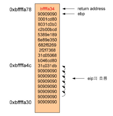 위 그림은 0xbffffa30~0xbffffa4c 영역에 NOP이 채워져 있다. return address를 이 영역 사이의 임의의 주소 값으로 바꾸면, EIP는 NOP을 계속 한 바이트씩 건너 뛰며 쉘 코드가 시작하는 0xbffffa4c 지점까지 이동하게 된다. 그러나 이 방법은 매우 힘들고, 현재에는 쉬운 방법들이 많이 나와있기 때문에 거의 사용하지 않는다.