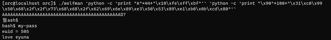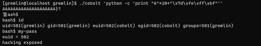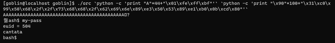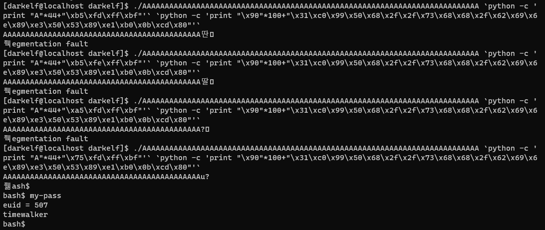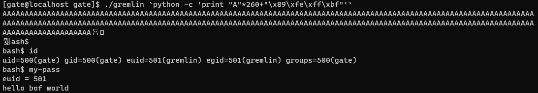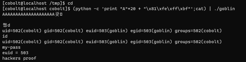 이렇게 argv[0]이 77자라면 argv[0] error가 나타나지 않습니다. 이후는 그동안 했던 익스플로잇 방법과 동일합니다.