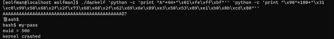 환경변수의 주소는 0xbffffe89입니다. 따라서 익스플로잇 코드는 buffer[256]+ebp[4]로 260byte를 채워야 하며, 다음과 같습니다.