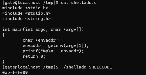 따라서 return 주소를 쉘코드의 환경변수의 주소로 조작합니다. 환경변수 등록과 주소를 알아내기 위한 코드는 아래와 같습니다.