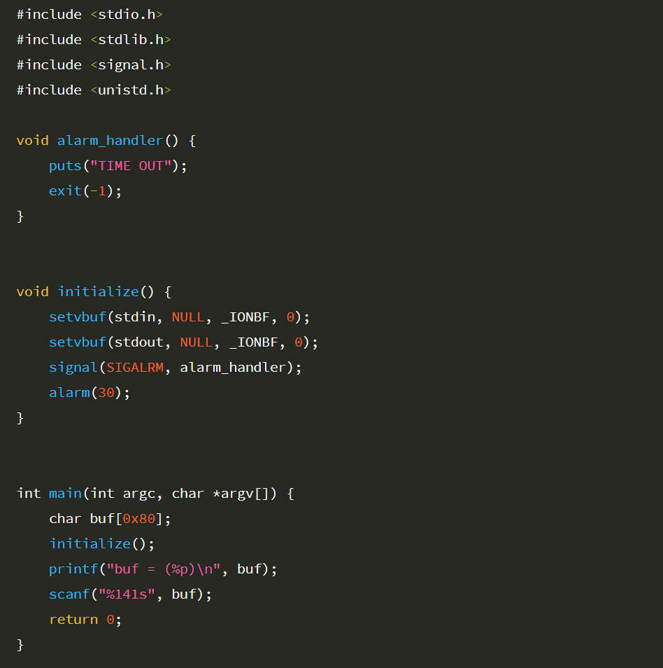 - scanf 함수를 통해 141byte만큼 문자열을 입력 받아 buf 배열에 저장