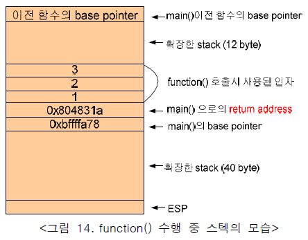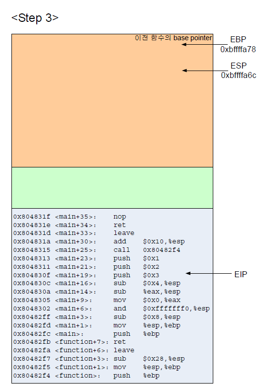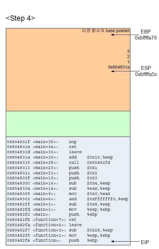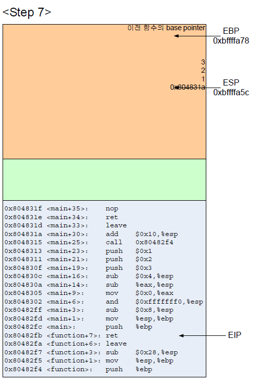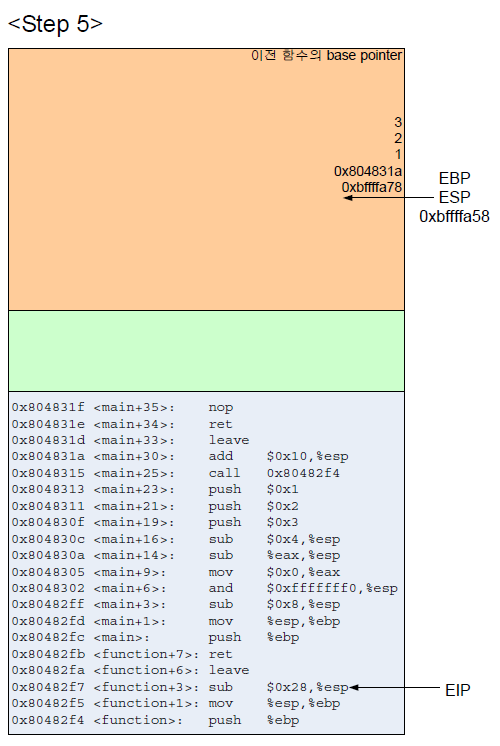 - 함수 프롤로그 과정: 함수가 시작될 때 stack pointer와 base pointer를 새로 지정하는 것