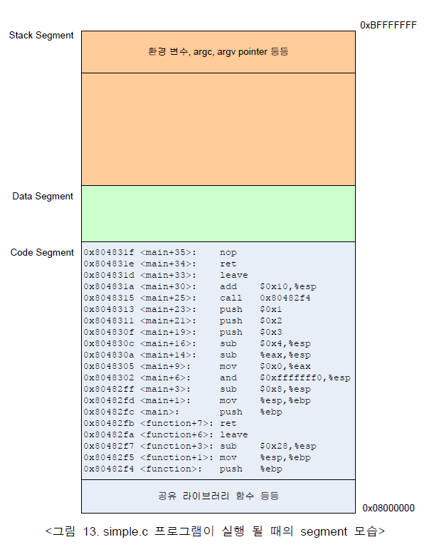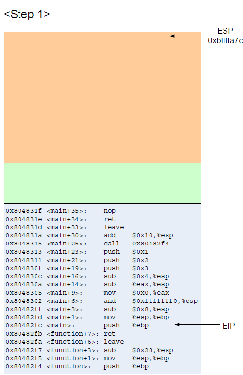 프로그램이 시작되면 EIP 레지스터(CPU가 수행할 명령이 있는 레지스터)는 main()함수가 시작되는 코드를 가리키고 있음