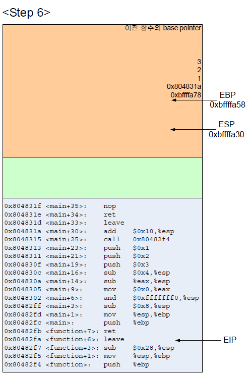function()함수에서도 마찬가지로 함수 프롤로그가 수행됨. main()함수에서 사용하던 base pointer가 저장되고 stack pointer를 function()함수의 base pointer로 삼음.