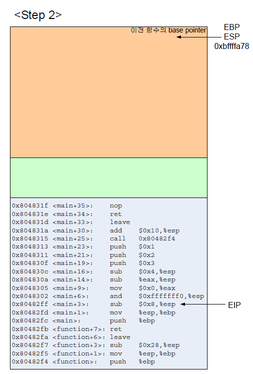 이 코드를 수행하여 이전 함수의 base pointer를 저장하면 stack pointer는 4바이트 아래인 0xbffffa78을 가리게 됨.