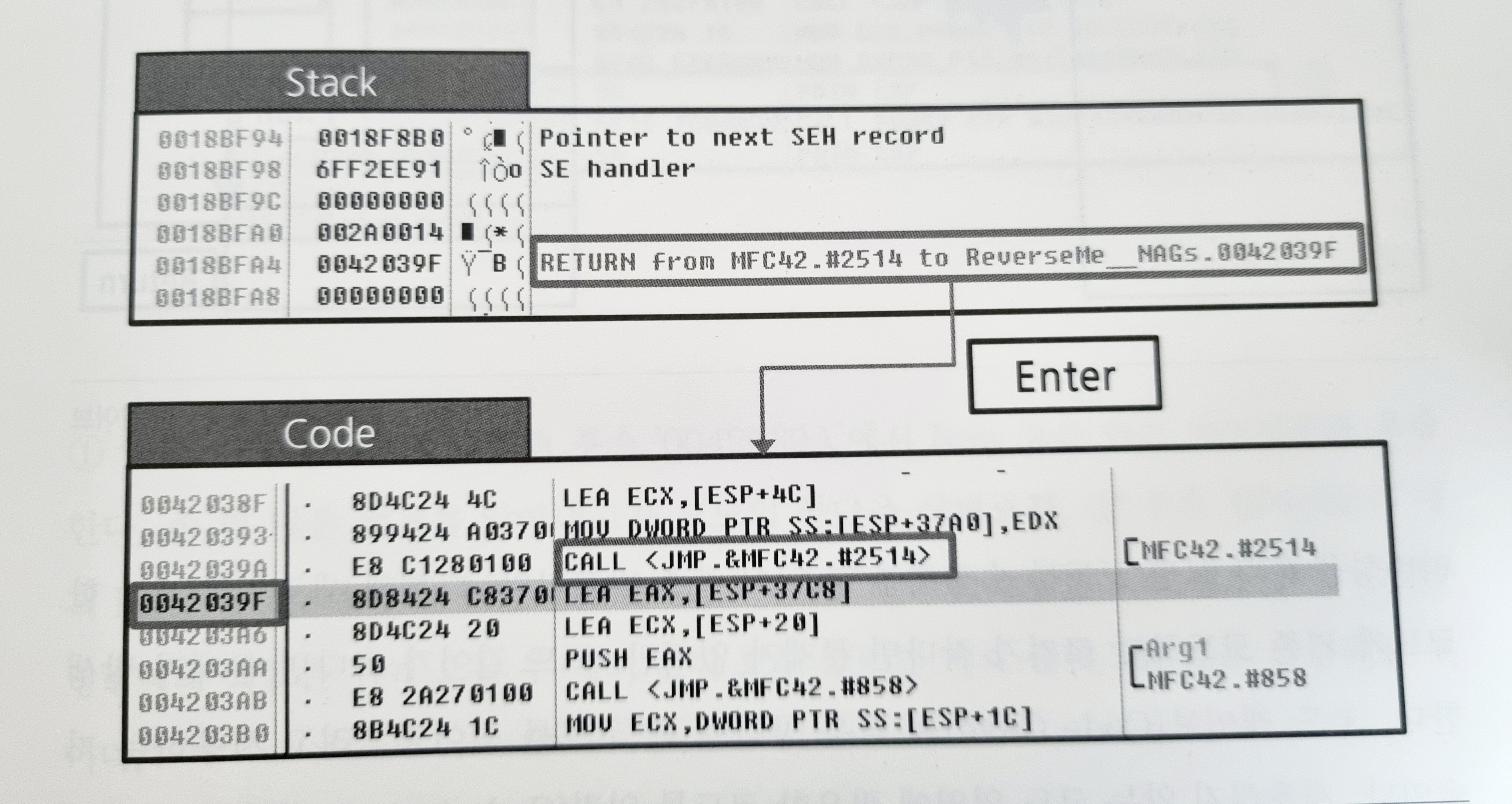스택 영역에서 Enter 키를 누르면 코드 영역으로 넘어간다. CALL <JMP.&MFC42.#2514>로 서브루틴 호출 확인이 가능하다.