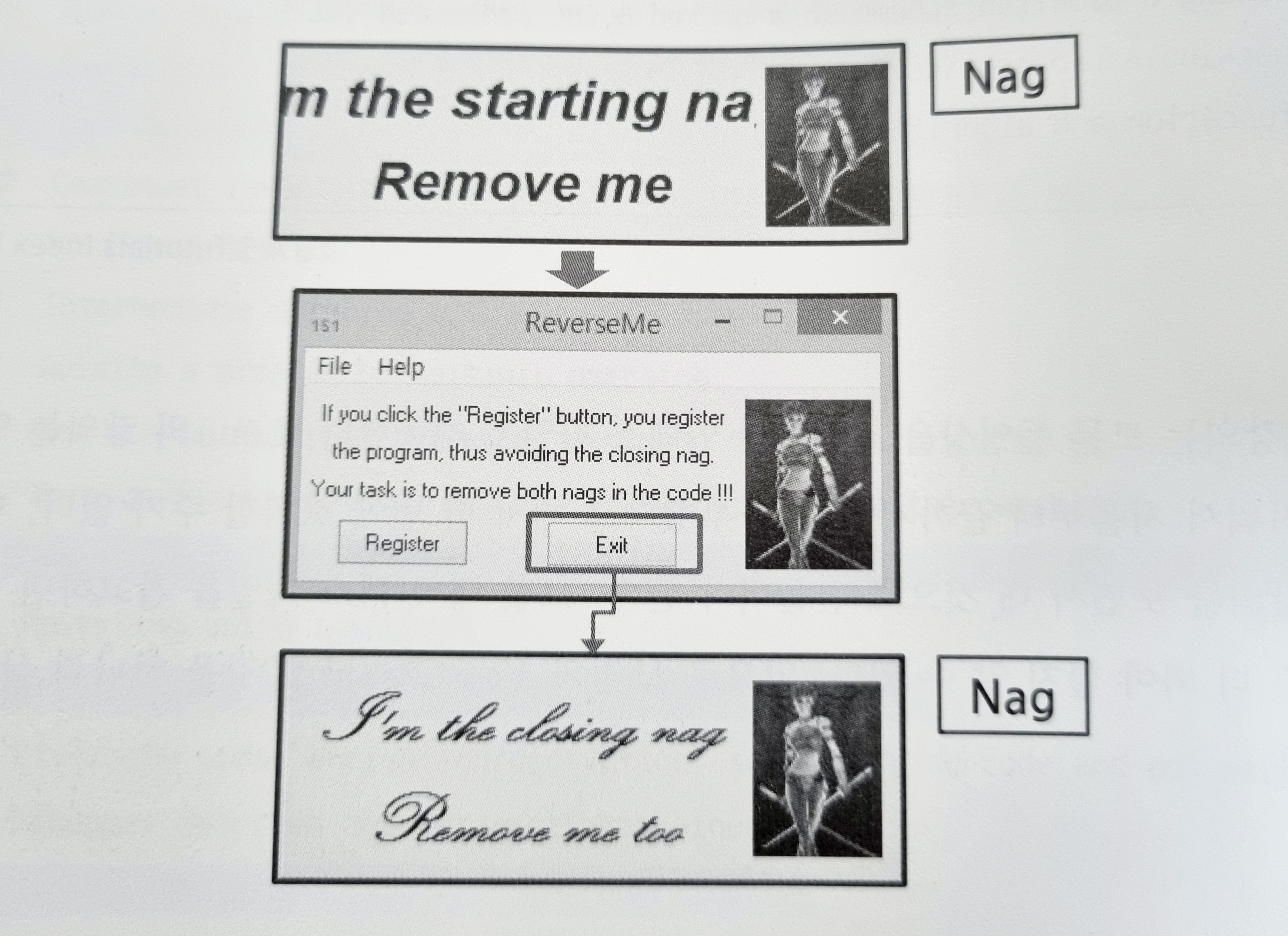 15강 파일을 다운로드 받아 압축을 풀면 'files' 디렉토리가 나온다. 그 디렉토리에 들어가 'ReverseMe. Nags.exe'을 실행하면 아래 문구가 뜬다. ReverseMe라는 창을 제외한 두 창이 Nag창으로 이것을 없애야 한다.