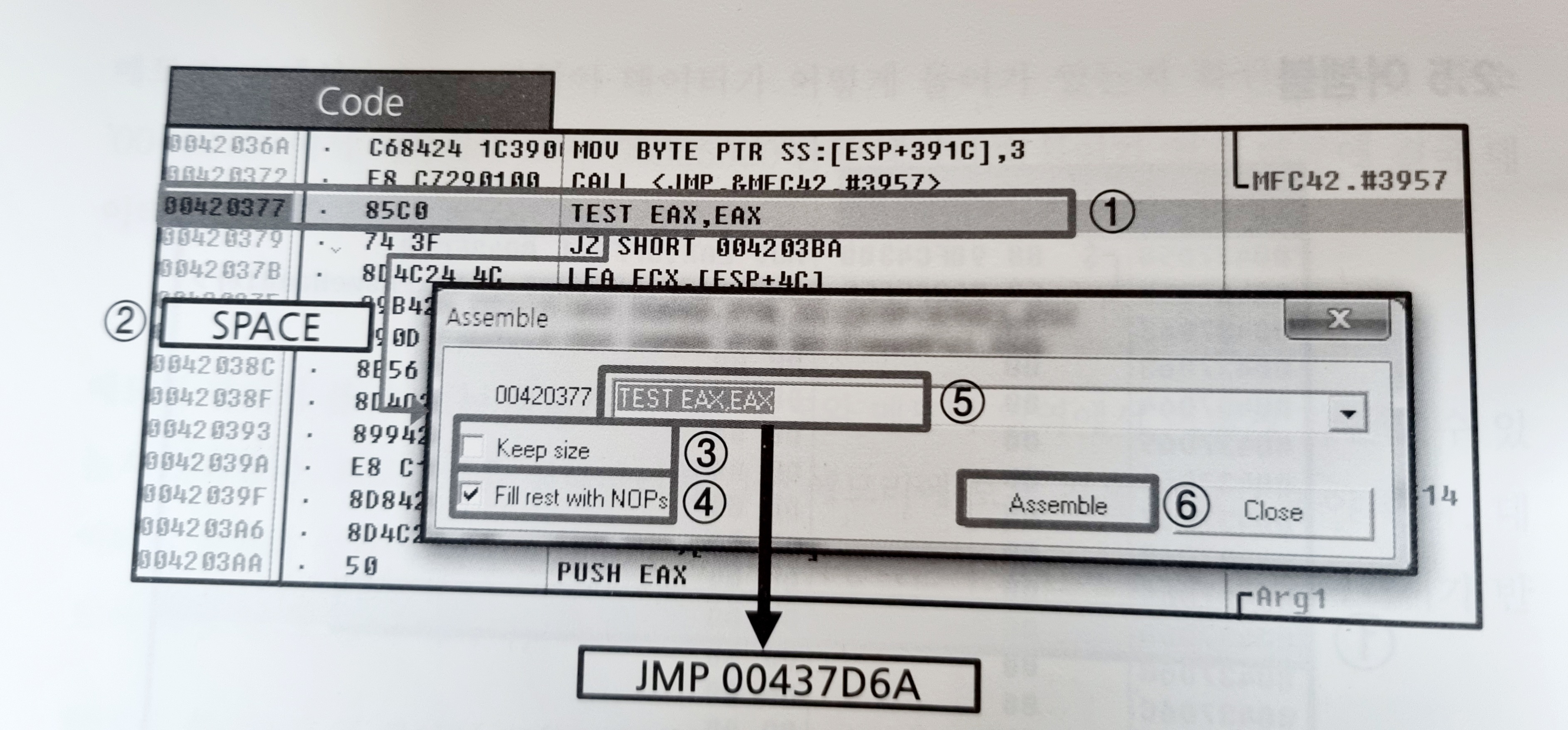 ① 주소에 브레이크포인트를 설정하고 ②에서 스페이스 바를 눌러 어셈블 창을 띄운다. 원래 명령어 대신 JMP 00437D6A를 입력한다.