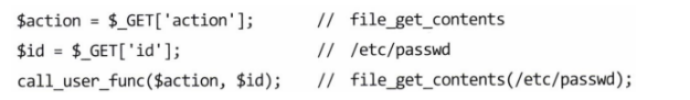 - 만약 악의적인 사용자에 의해 id의 값으로 ‘/etc/passwd’를, action의 값으로 ‘file_get_contents’를 전달했다면, 해당 ‘file_get_contents’ 함수가 호출되며 지정된 파일 ‘/etc/passwd’를 읽게 됨.