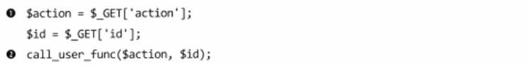 - php 함수 중 하나인 call_user_func는 첫 번재 파라미터를 호출하고 나머지 파라미터를 해당 함수의 인수로 전달함. 아래의 경우, 애플리케이션은 action 변수에 할당된 view 함수를 호출하고, 1을 함수에 전달하며 첫 번째 게시글을 보여주게 됨.