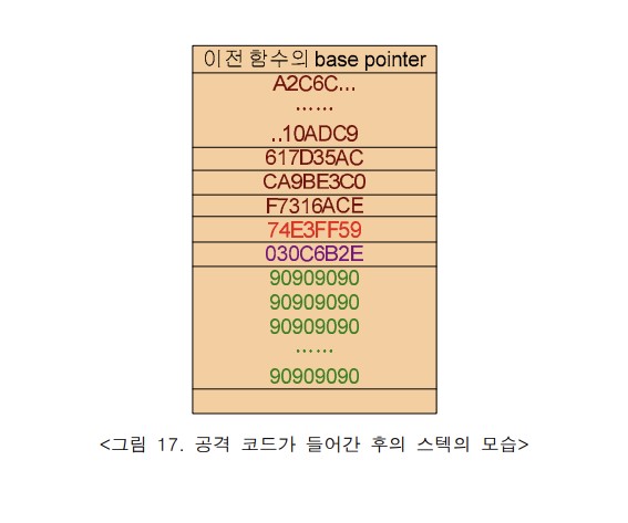 strcpy가 호출되고 나면 스텍안의 데이터는 <그림 17>과 같이 된다.