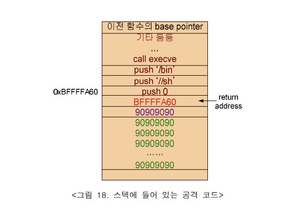 <그림 18>에서 보여주는 공격 코드는 execve(“/bin/sh”,…) 이다. 즉 쉘을 띄우는 것이다. 실제 쉘 코드가 그림처럼 들어가 있는 것은 아니다. 쉘 코드를 기계어 코드로 변환하여 1 word 단위로 넣어가면서 따져보면 알 수 있겠으나 <그림 18>은 저 위치에 저런 의미의 코드가 들어있다는 개념을 표현한 것이므로 그 개념만 이해하기 바란다.