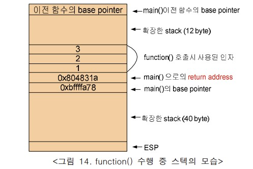 <그림 14>에서 보는 스텍의 모습은 40바이트의 스텍이 준비되어 있으나 40바이트 보다 큰 데이터를 쓰면 버퍼가 넘치게 되고 프로그램은 에러를 발생시키 게 된다. 41~44바이트의 데이터를 쓴다면? 이전 함수의 base pointer를 수정하게 될 것이다. 더 나아가 45~48바이트를 쓴다면 return address가 저장되어 있는 공간을 침범하게 될 것이 고 48바이트 이상을 쓴다면 return address뿐만 아니라 그 이전에 스텍에 저장되어 있던 데 이터 마저도 바뀌게 될 것이다.