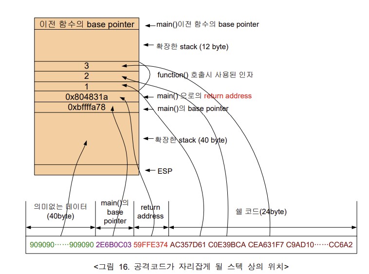 공격자가 base pointer를 직접적으로 변경하지 않는다면 정확히 해당 위치에 있는 값이 EIP에 들어가게 되어 있다. 따라서 buffer overflow 공격은 공격자가 메모리상의 임의의 위치에다 원하는 코드를 저장시켜 놓고 return address가 저장되어 있는 지점에 그 코드의 주소를 집어 넣음으로 해서 EIP에 공격자의 코드가 있는 곳의 주소가 들어가게 해 공격을 하는 방법이다.