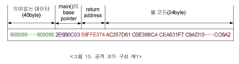 알다시피 strncpy() 과 같은 함수는 몇 바이트나 저장할지 지정해 주지만 strcpy함수는 길이 체크를 해 주지 않 기 때문에 receive_from_client 안에 들어있는 데이터에서 NULL(\0)를 만날 때까지 복사를 한다. <그림 14>와 같은 스텍 구조에서 45~48바이트 위치에 있는 return address도 조작해 줘야 하고 공격 코드도 넣어줘야 한다. <그림 15>와 같은 구성의 공격 코드를 생각해 보자 (실제 값들은 아무런 의미가 없는 임의의 값이다).