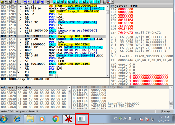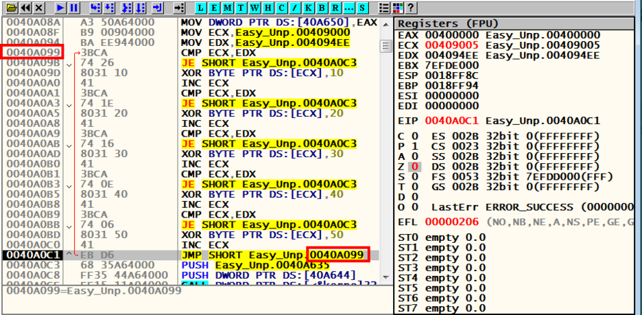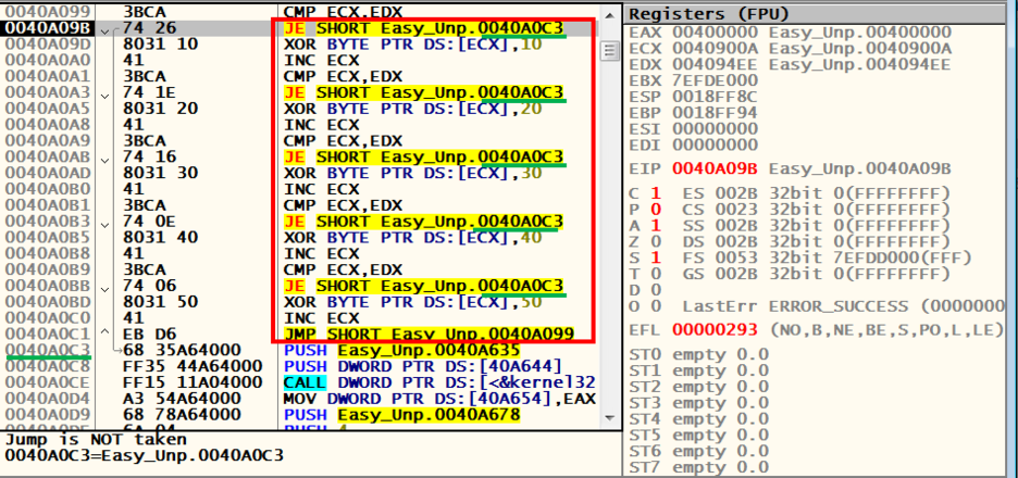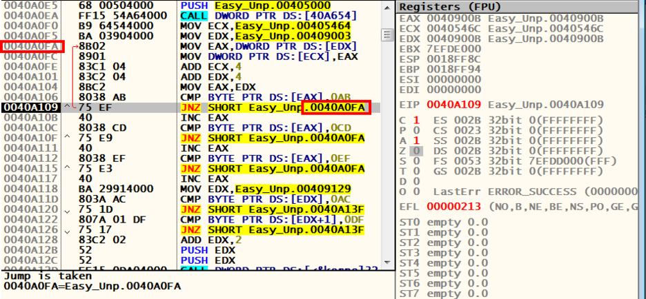 이 반복문의 과정을 거치면서 패킹 되었던 프로그램이 일종의 복호화가 된다고 생각하면 될 것 같다.
