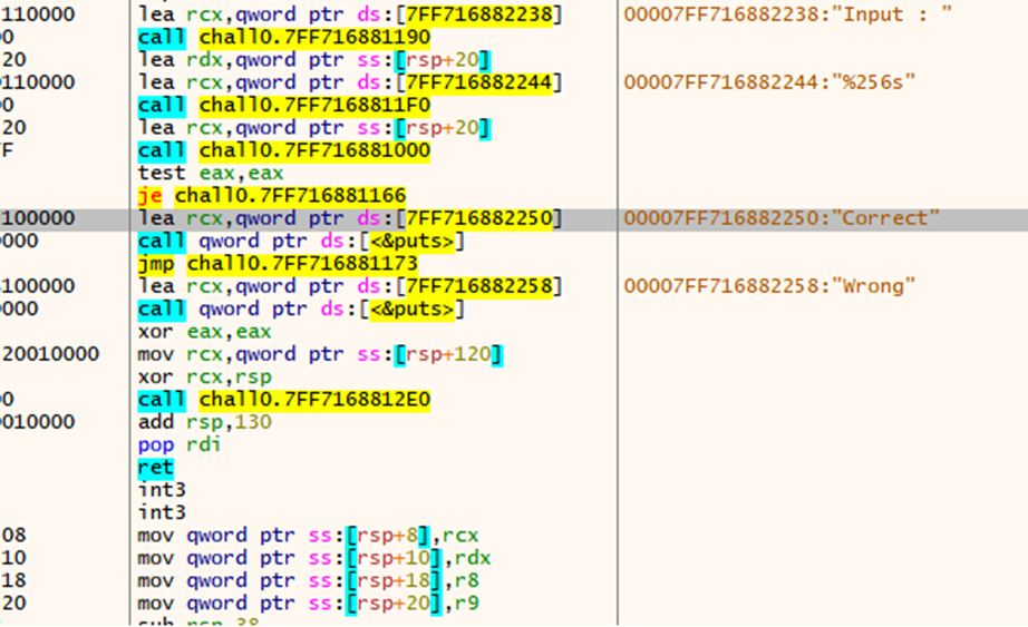 1) input 함수를 통해 flag 값을 입력하면 'chall3.7FF6CBF01000' 함수에서 입력 값 비교한 후, correct나 wrong 메시지 출력