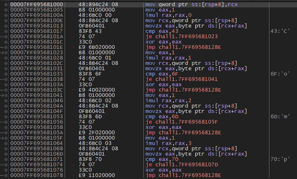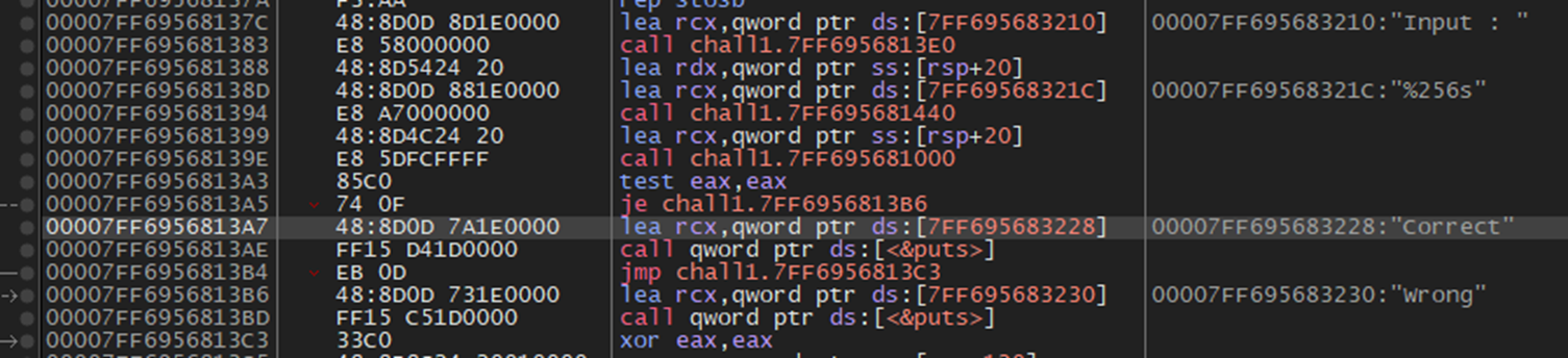 1) input 함수를 통해 flag 값을 입력하면 'chall1.7FF6956813B6' 함수에서 입력 값 비교한 후, Correct나 Wrong 메시지 출력
