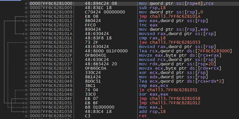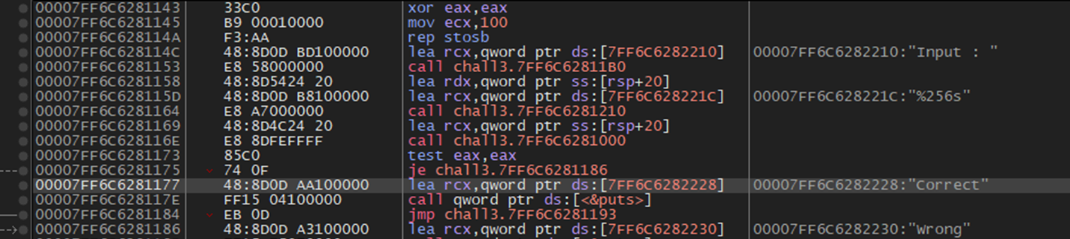1) input 함수를 통해 flag 값을 입력하면 'chall3.7FF6CBF01000' 함수에서 입력 값 비교한 후, correct나 wrong 메시지 출력