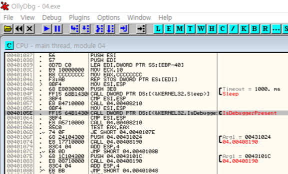 'Sleep'와 'IsDebuggerPresent'가 있는 걸 볼 수 있다.