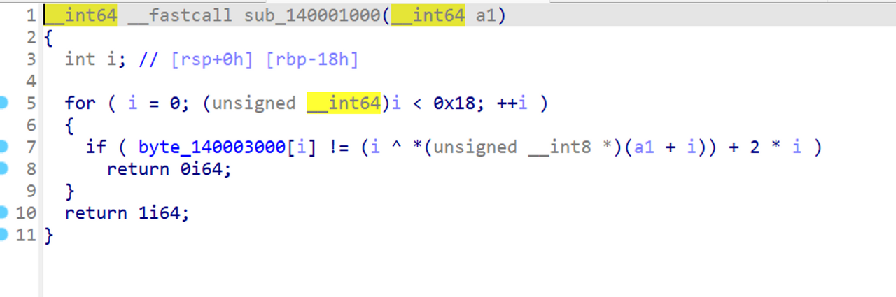 for 문 안에 있는 if 문을 보아하니 내가 입력한 a1 배열에 i를 xor하고 2*i를 더한 값이 byte_140003000[i]여야 한다.
