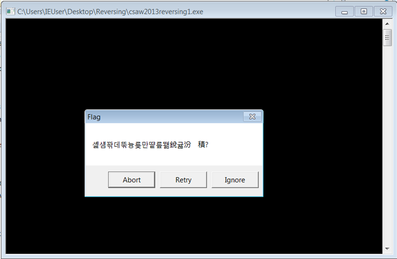 프로그램을 실행시키면 다음의 Flag 팝업창이 뜨는데, 이상한 한글이 뜬다.